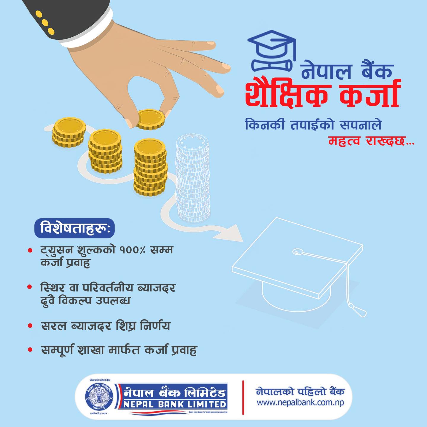 Absence of any bank in Nepal was hampering the economic progress of the country. This was taken into consideration by Nepal Bank Limited with key focus on overcoming such economic hamper and difficulties of general public. This was initiated by providing banking services to people removing their inconvenience. This objective got better and bigger with the time. Nepal Bank Limited has so far adopted according to the technological changes, national economic welfare, customer preferences in services, market competition and global financial scenarios to become a leading, glorious and highly reputed bank of Nepal.