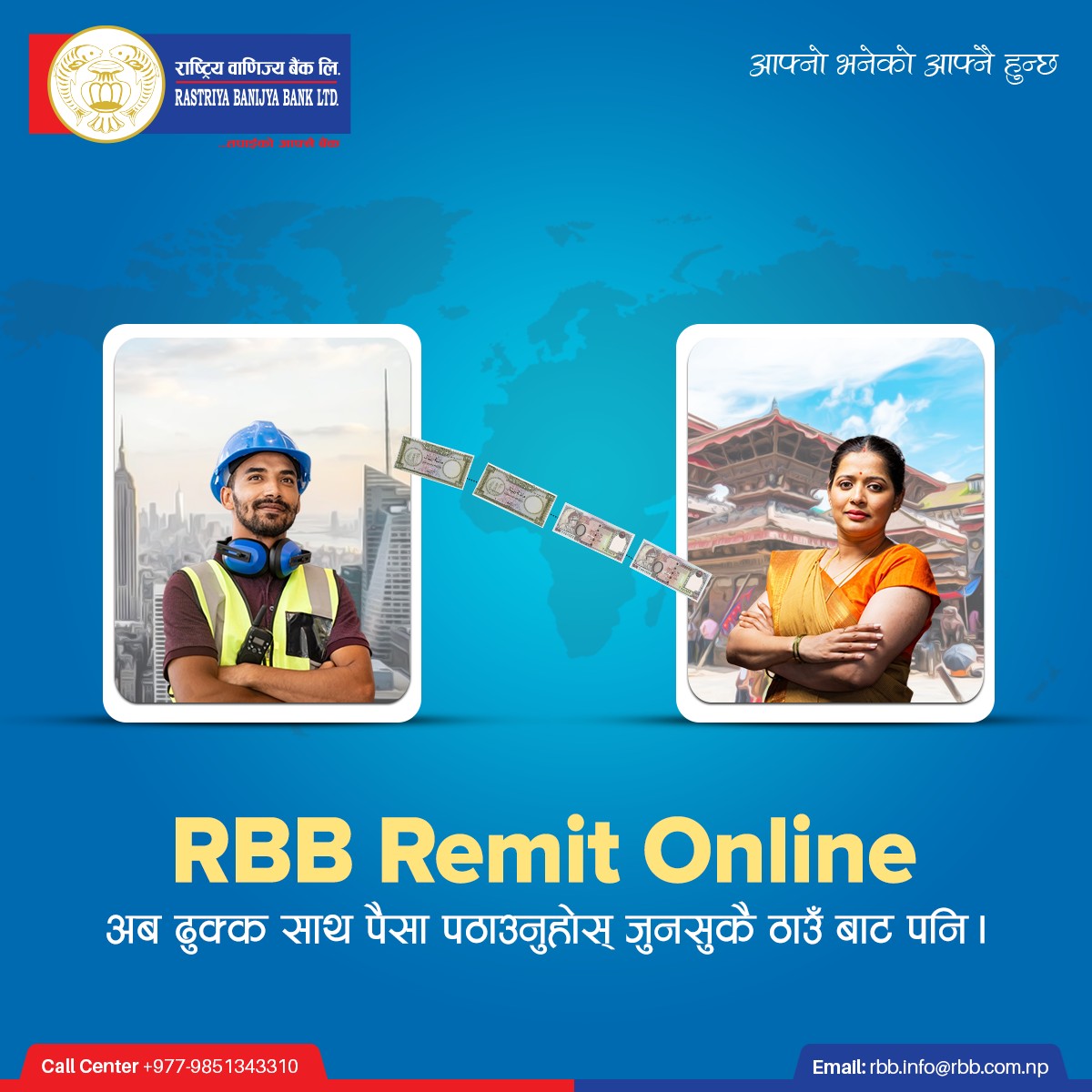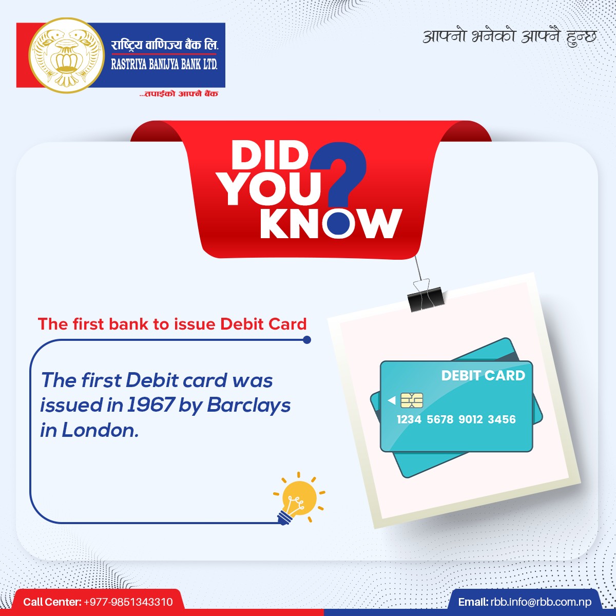 Rastriya Banijya Bank Limited (RBBL) has a history of serving its customers far and wide across the nation for more than half a century. The bank then fully owned by Government of Nepal, was established on 10 Magh 2022 (23 January 1966) under the special statute "Rastriya Banijya Bank Act, 2021" and had operated under "Commercial Bank Act,2031” until it was re-registered as public limited company on 6 Baishak 2063 (19 May 2006). At present, the Bank operates as "A" class financial institution licensed by Nepal Rastra Bank and carries out commercial banking activities as per the provisions of the "Bank and Financial institutions Act 2073," (2017).
