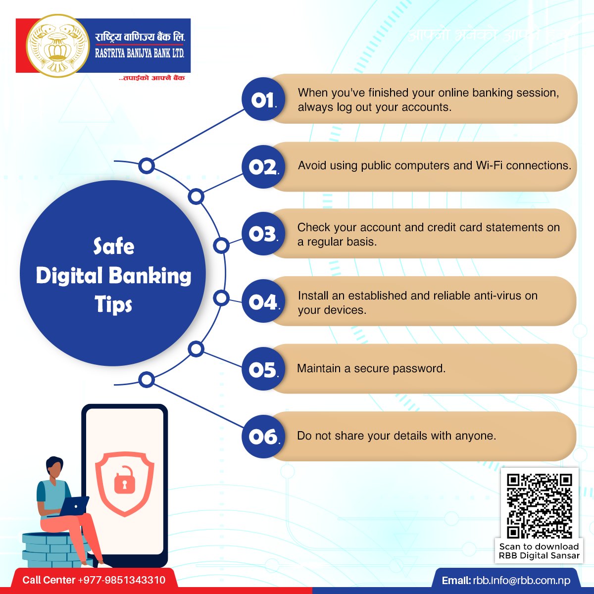 RBBL endured many stressful years of business and faced existential questions at some point of time in the past. But learning the lessons from the events and craving towards the brighter future, the Bank successfully implemented a restructuring plan; and now it stands as one of the most preferred bank with the highest number of customers all 77 districts and 7 provinces of the country. The Bank has been able to imprint its presence in national economy through efficient allocation of resources in all sectors of economy thereby enhancing production and generating employment opportunities within the country. The unflinching faith and goodwill bestowed by our customers continued support from the Government, well wishers and general public has been the reason for us to stand as the most trusted bank in the country.