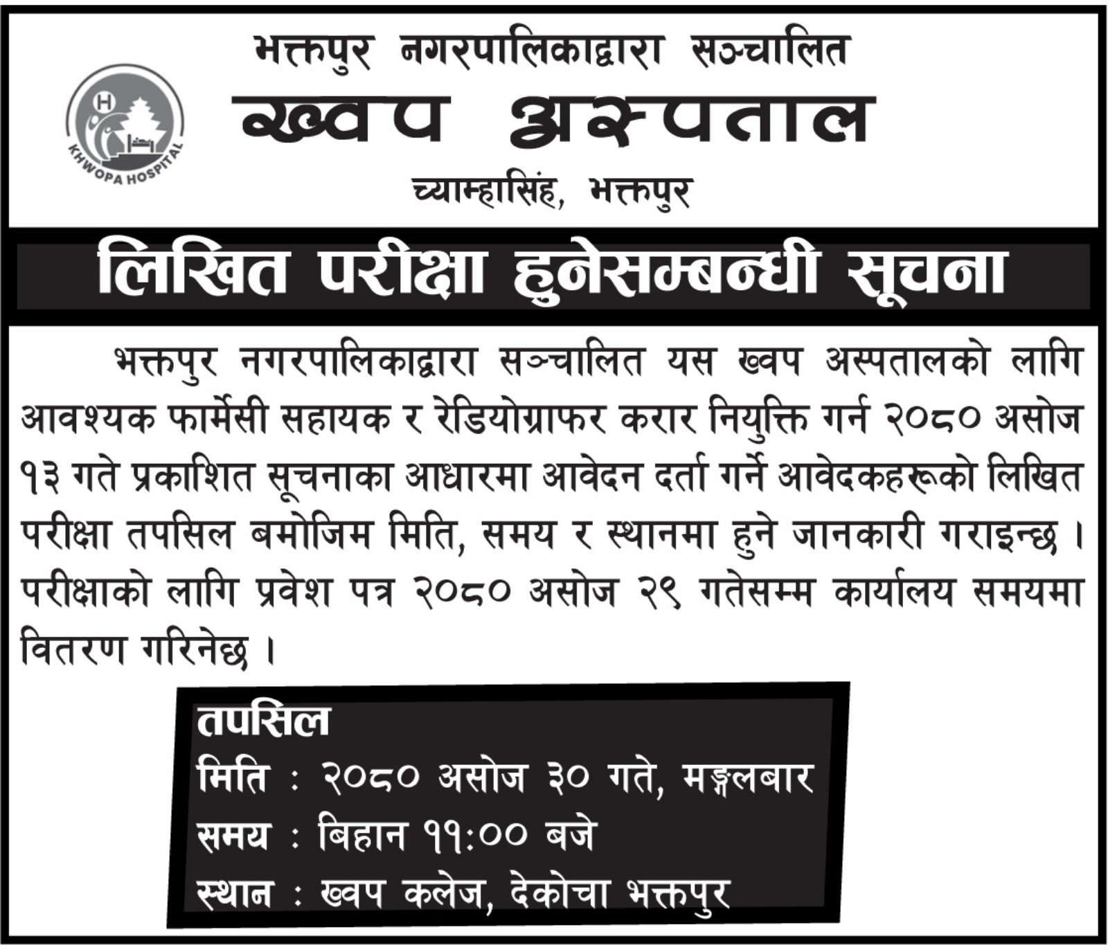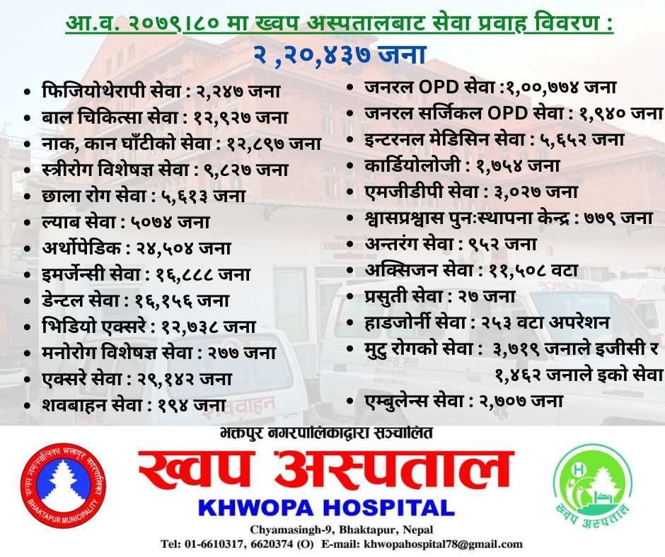 Khwopa Hospital is an undertaking of Bhaktapur Municipality providing quality Health Service to the People.